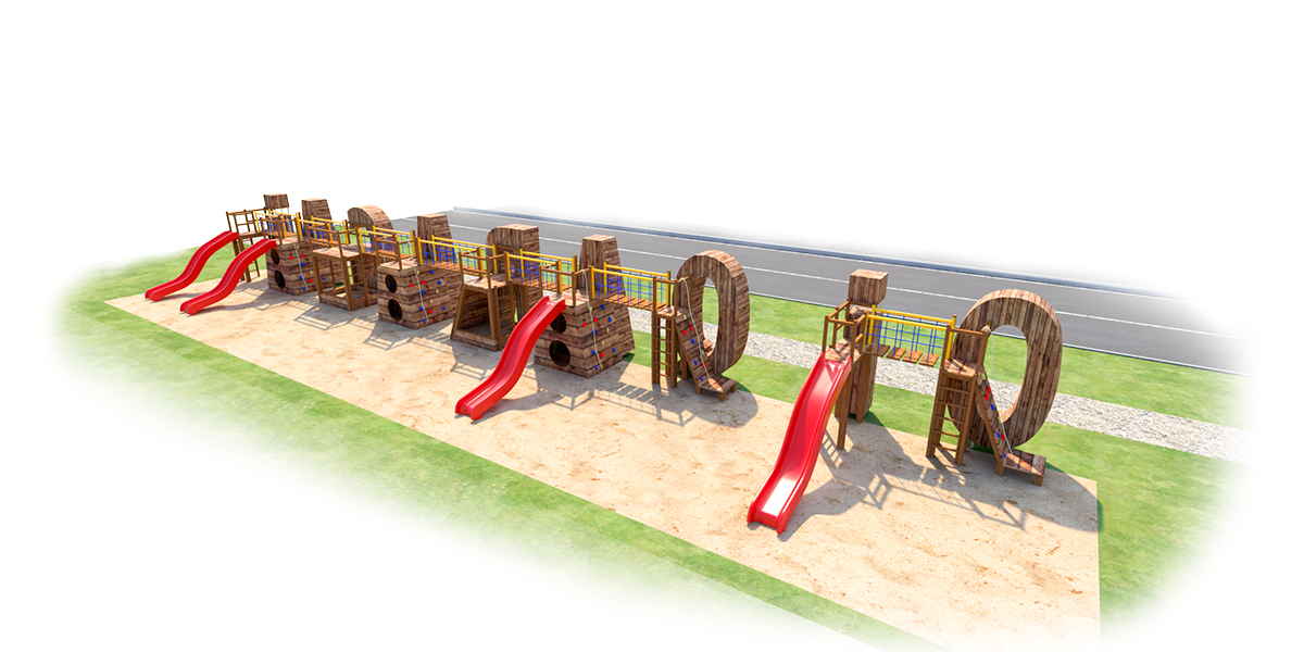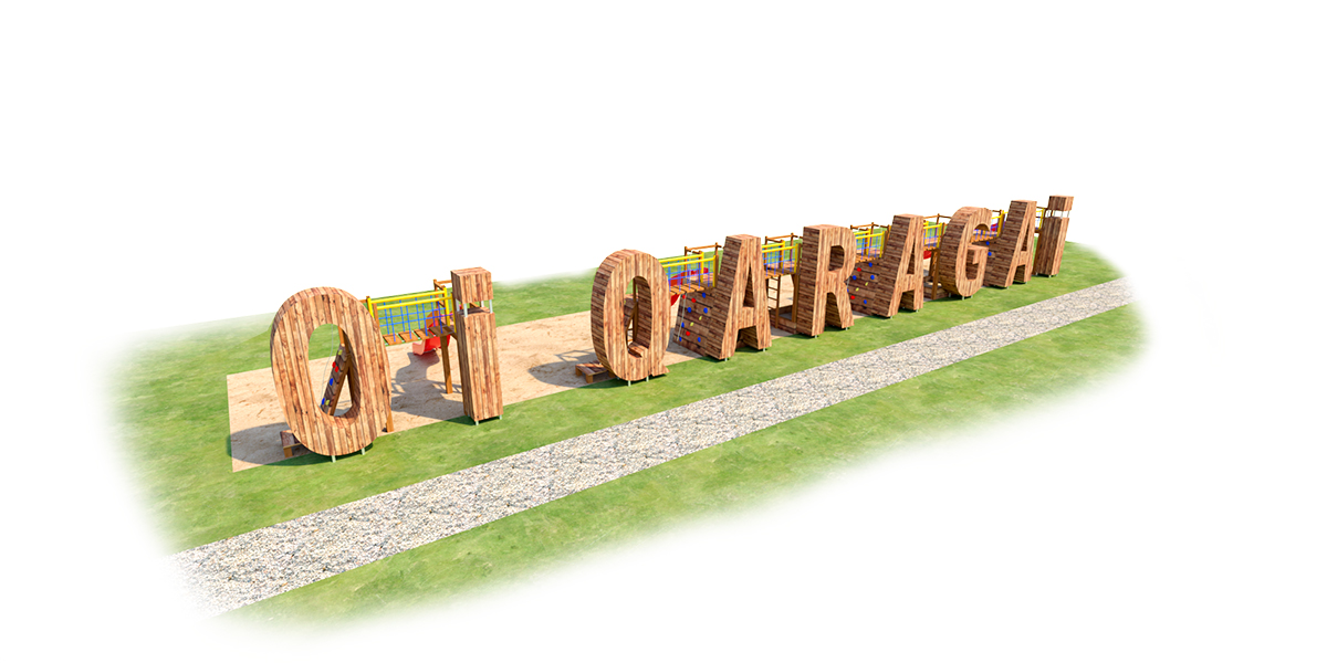 Буквы для названия рекреационной зоны “Oi Qaragai” расположены вдоль дороги около главного въезда на территорию и являются одновременно логотипом курорта и детской игровой площадкой. Основная идея проекта предполагает максимальное использование природных материалов и безопасность игровой среды для детей.