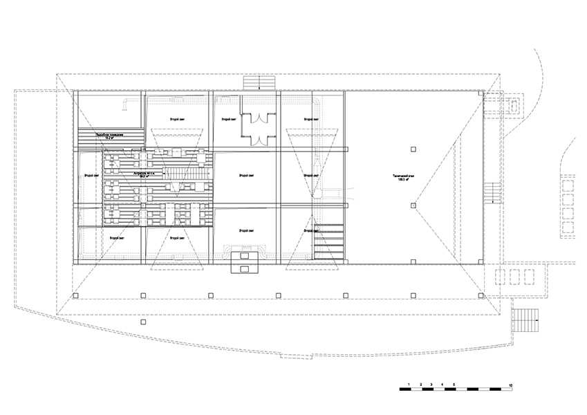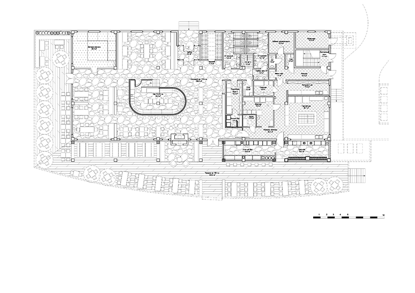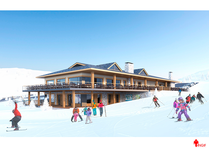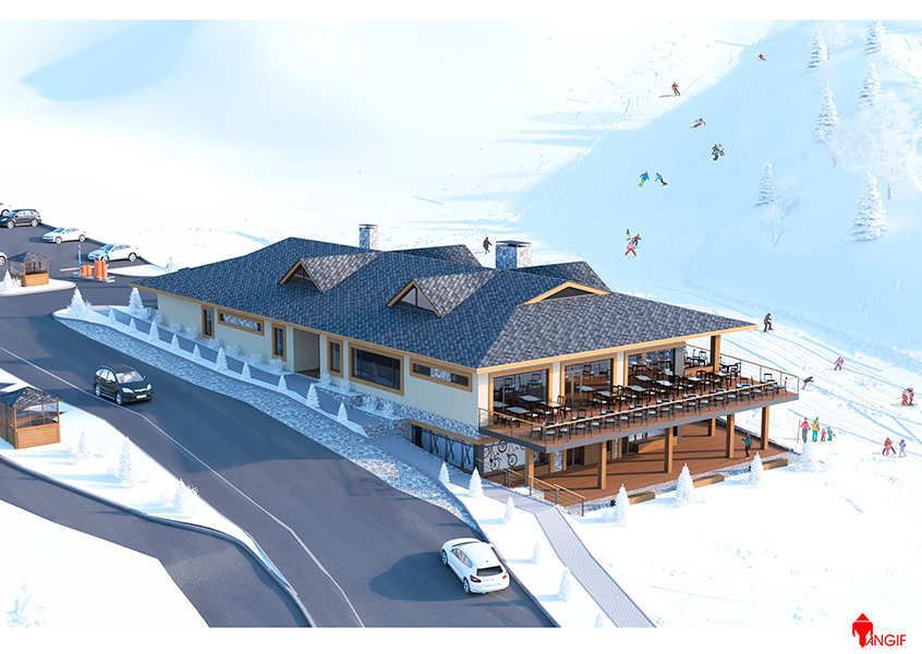 Проектируемый ресторан представляет собой прямоугольное в плане одноэтажное здание размером 18 м х 36 м с цокольным этажом и большой террасой для организации посадочных мест на открытом воздухе с видом на горы.